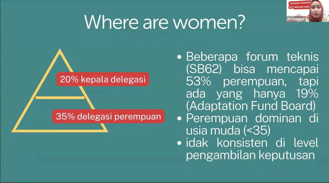 Di sisi lain, Kristina Viri, perwakilan FPH, menjelaskan alasan pentingnya peran perempuan dalam proses negosiasi terkait krisis iklim. Kristina menjelaskan bahwa perempuan merupakan garda terdepan dalam advokasi iklim dan lingkungan yang bisa tercermin dari kasus Kendeng, Wadas, dan Newmont Minahasa Raya. Selain itu, perempuan dinilai cenderung menggunakan pendekatan yang lebih minim konflik dibandingkan laki-laki.